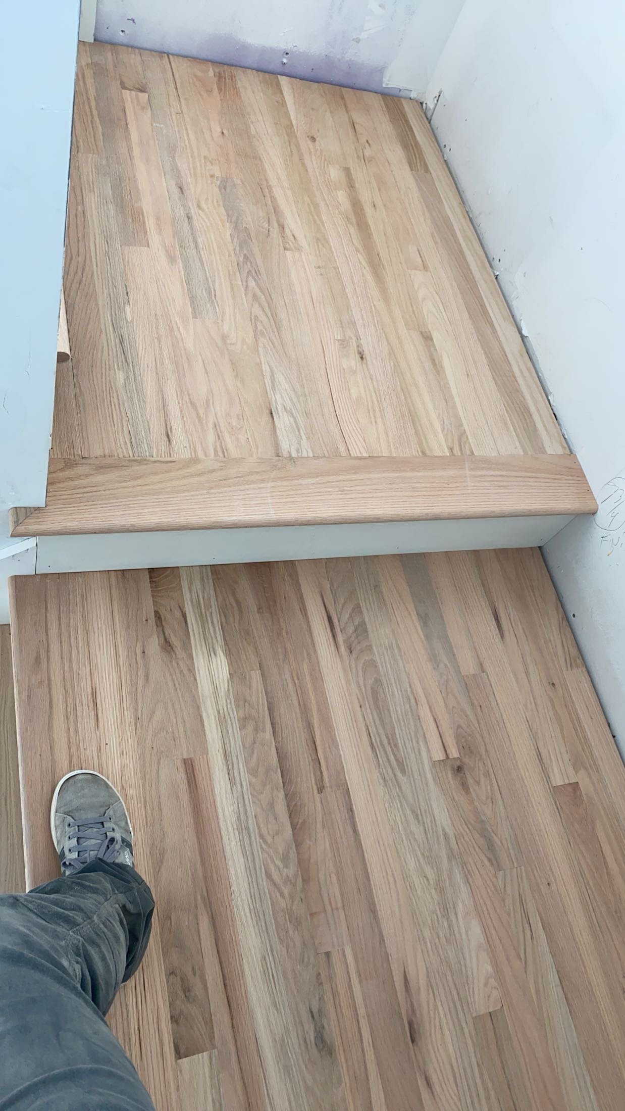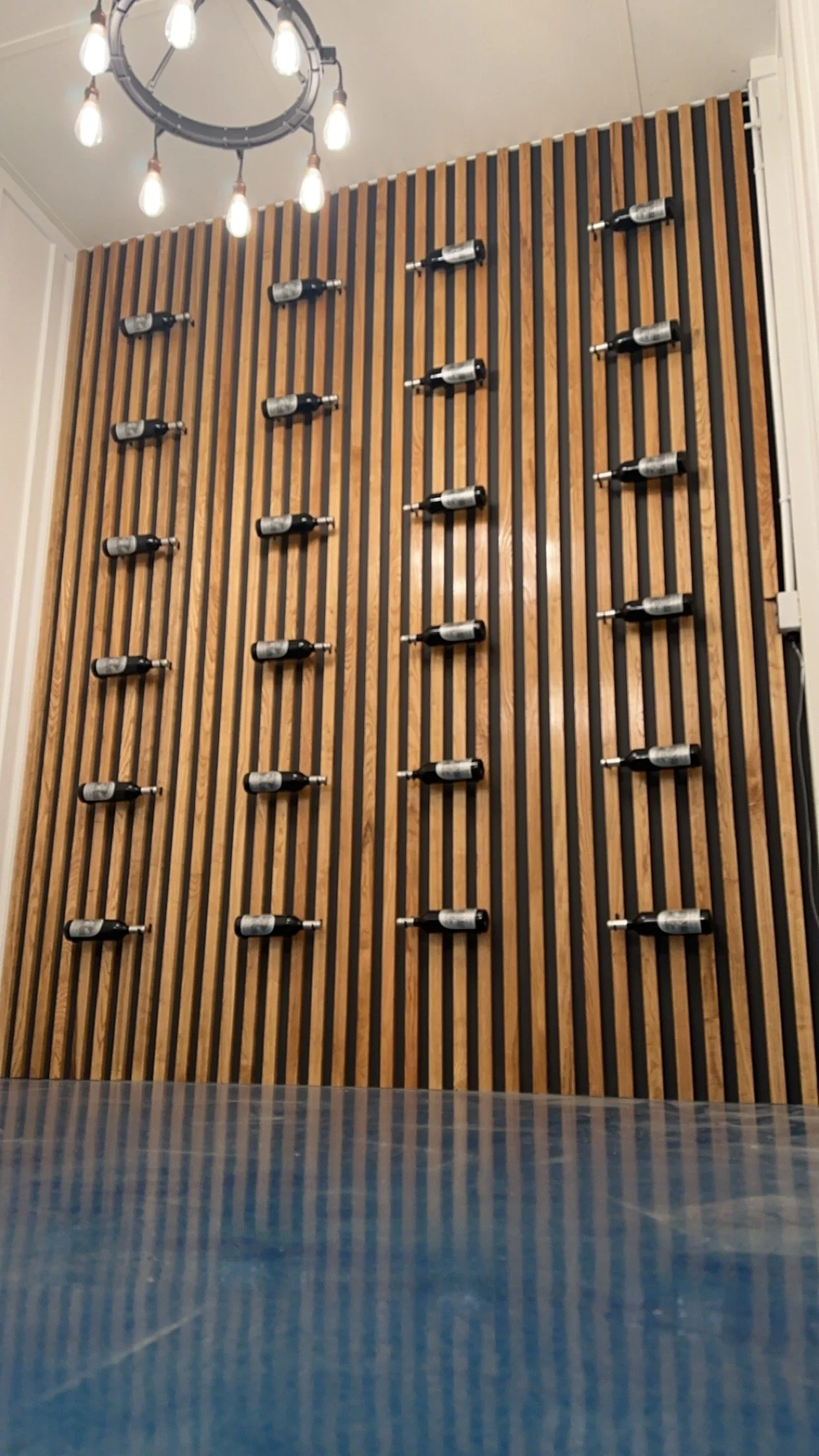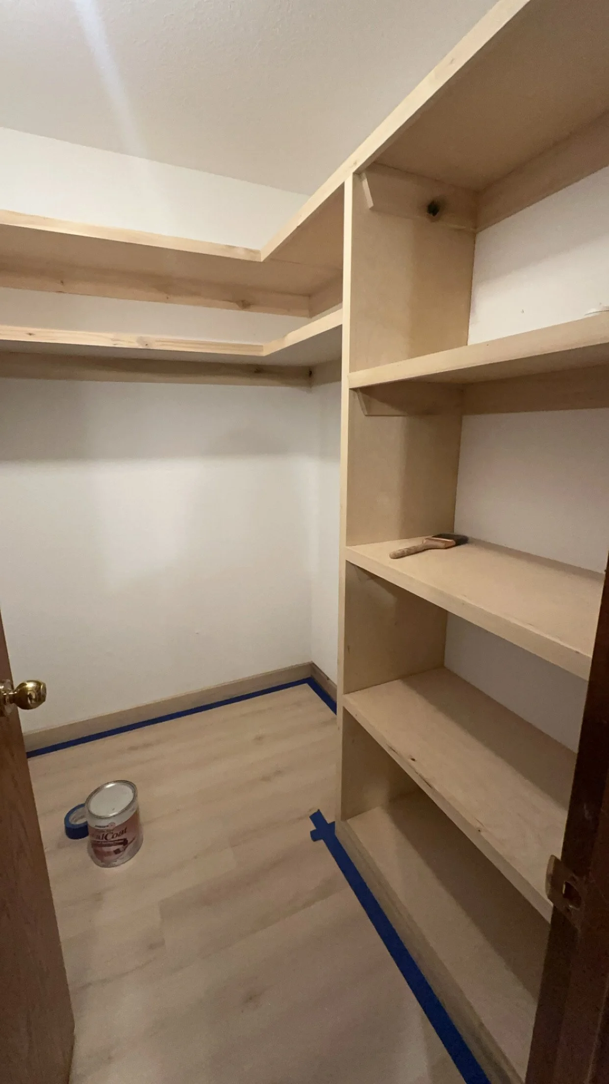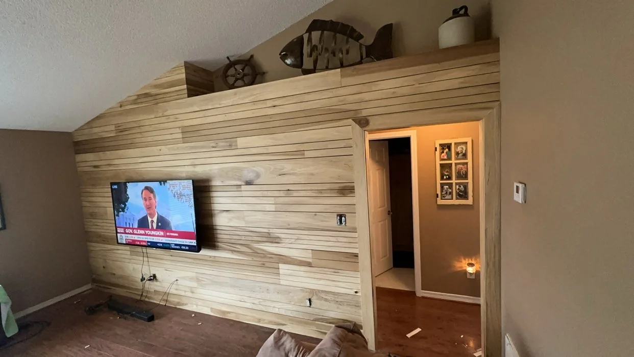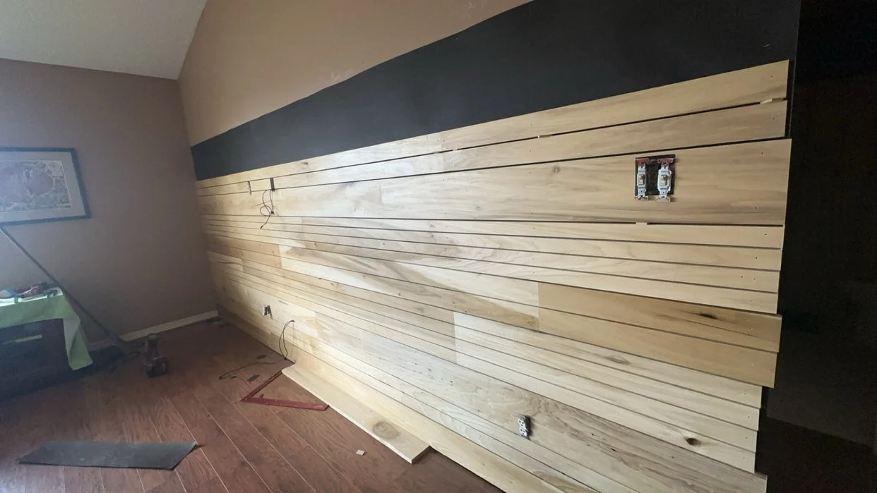 White washed nickel gap with a dark stained pine trim. Basement under a custom log home in Lebanon, TN.
