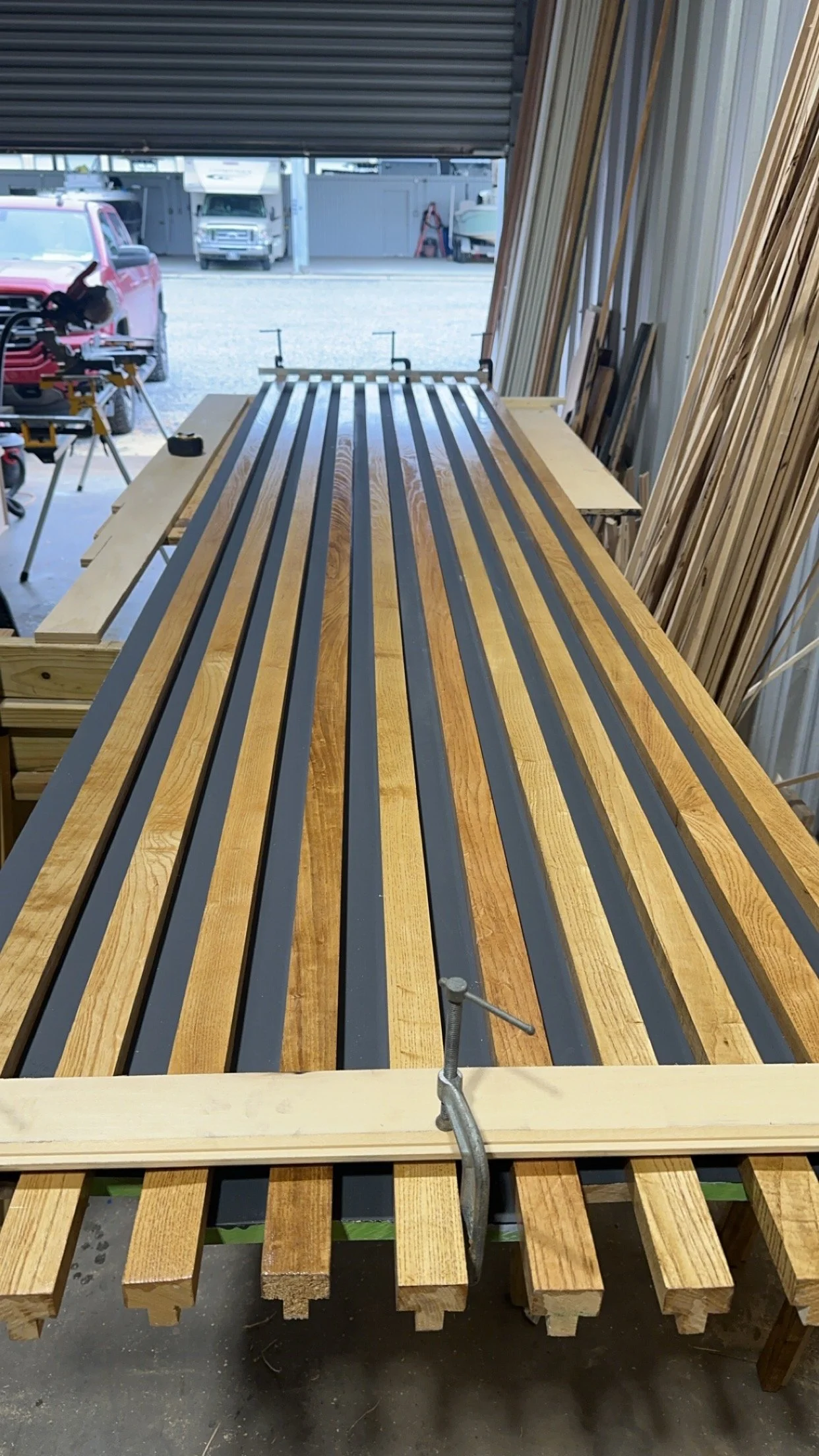 Cypress v-joint garage doors built at a wedding venue in central Alabama.